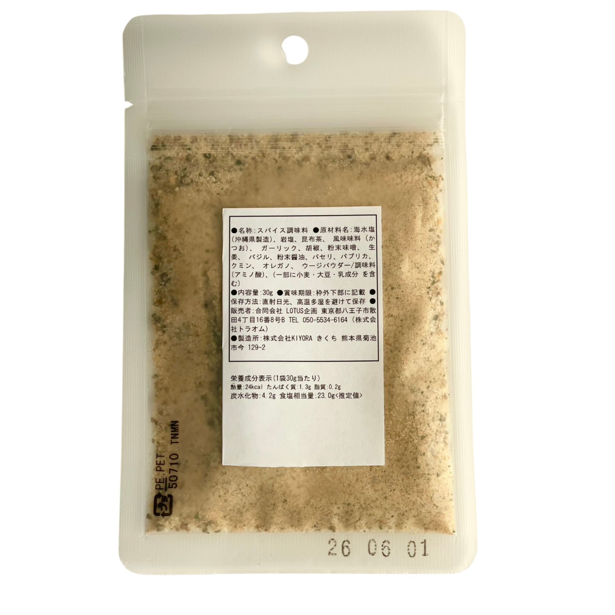 ●原材料名:海水塩(沖縄県製造)、岩塩、昆布茶、風味味料(かつお)、ガーリック、胡椒、粉末味噌、生姜、バジル、粉末醤油、パセリ、パプリカ、クミン、オレガノ、ウージパウダー/調味料